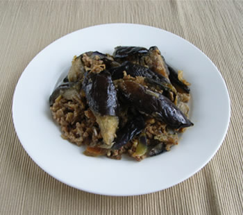 5.香りが立ったら、豚肉を入れて炒め、肉の色が変わったら、Aの調味料を加え、その後、強火にしてなすを入れて味を絡ませる。