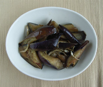 2.鍋になすを入れて、水気を飛ばしてから、ごま油を入れて強火でいためる。油がまわったら、酒、昆布つゆ、煮干、水大さじ2~3を加える。