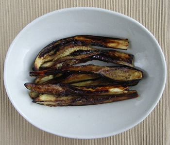 2.フライパンにごま油を熱し、なすを焼き目がつくまでいためる。