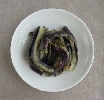 5.なすが柔らかくなったら、菜箸等ではさんで水気を絞ってから、たれをかけておき、味をなじませる。