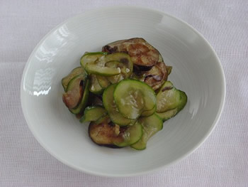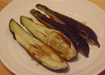 1.フライパンを熱し、油を入れ、なすを弱火でじっくり焼く。