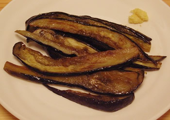 2.なすを、たて4つに切り、しょうゆと練がらしを混ぜたものをかける。