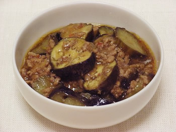 3.肉の色が変わったら、なすをいため、焼き色がついたら、トマト缶(好みに応じて、固形スープも)を入れ、ふたをして、15~20分煮る。