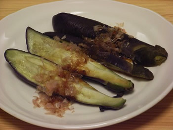 2.なすを、たて4つに切り、酢醤油とかつお節をかける。