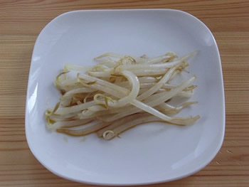 1.もやしは洗って、ポリ袋に入れて、1分30秒加熱し、ざるにあげて水気を切る。