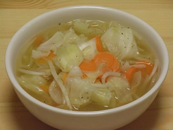 これは私の先輩から教わったレシピです。ほぼ毎晩、このスープにパスタをいれて、スープパスタにして、食べているそう。ダイエットのために作るうちに、すっかりこの味にはまってしまったそうです。レシピを聞く限りでは、味の予想がちょっとつかなかったのですが、ちゃんぽんのスープの部分だと気づきました。ちゃんぽんスープが、コンソメとしょうががベースになっているということに、初めて気づいた一品です。