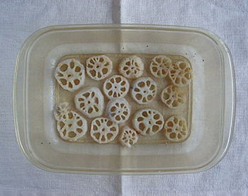 1.れんこんの皮をピーラー等でむき、厚さ7mm位の輪切りにして、
