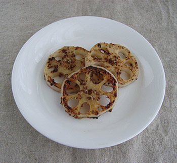 1.レンコンは、1cm幅の輪切りにし、皮をむく。