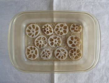 1.レンコンは皮をピーラー等でむき、6mm位の厚さに切る。