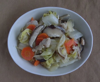 2.耐熱ボウルに、やわらかい野菜から入れていく。白菜の葉、生しいたけ、長ねぎ、白菜の茎、にんじんを載せる。