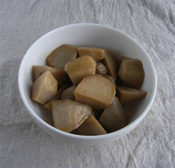 2.里芋の粗熱が取れたら、皮をむき、2~3cm厚さに切る。