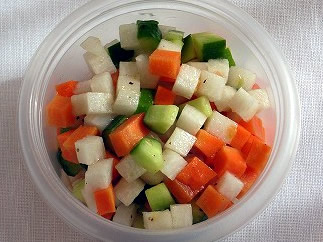 1.大根とにんじんは、1cm角に切って、塩少々を振っておく。