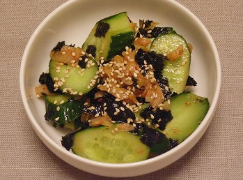 3.器にきゅうり、キムチ、ごま油、しょうゆを入れ、焼き海苔をちぎりながら入れて、混ぜる。白ごまをふりかける。