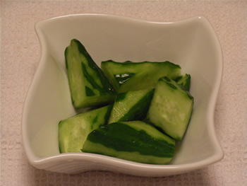 1.きゅうりを洗って、乱切りにする。