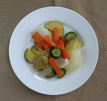 1.玉ねぎは、大きめのくし切り、きゅうりは1.5cm厚さの輪切り、じゃがいもは、8mm厚さの輪切りにし、食べやすい大きさに切る、にんじんは5cm長さの拍子切りにする。