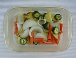 2.野菜を全て耐熱容器に入れ、塩、オリーブ油を振って、よく混ぜる。