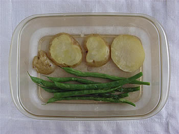 2.耐熱皿にオリーブ油と塩を入れて混ぜ、じゃがいもといんげんを入れる。