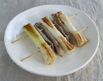 3.1をジャバラに折りたたむようにして、2と同じ大きさにまとめ、ねぎ、肉、ねぎと肉をはさむようにいかだを作り、竹串でとめる。