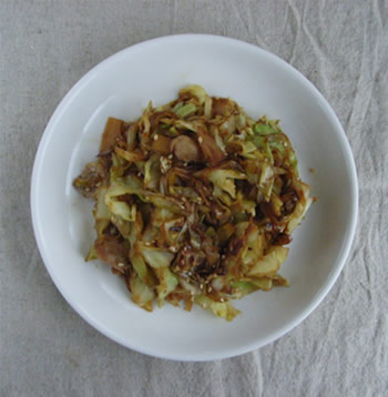 4.キャベツが柔らかくなったら、ふたを取って、豚肉を戻し入れ、おろししょうが、酒、しょうゆを入れて、全体を混ぜ炒める。白ごまを入れて、最後に塩、こしょうで味を調える。