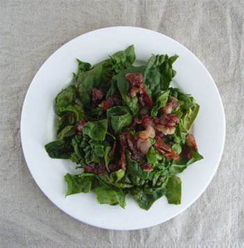 2.ベーコンは1cm幅に切る。フライパンにサラダ油を熱し、ベーコンをかりかりになるまで焼く。塩、こしょう、酢を入れて、仕上げたら火を止めて、1のほうれん草に回しかける。塩、こしょうで味を調える。