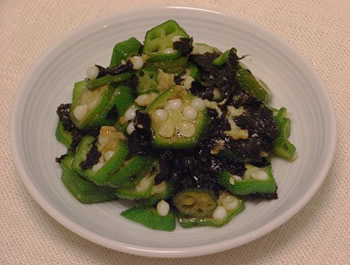 3.オクラを器に盛り、のりを細かくちぎって混ぜる。酢としょうゆとしょうがをかけて食べる。(味加減は食べながらやってみて下さい。)