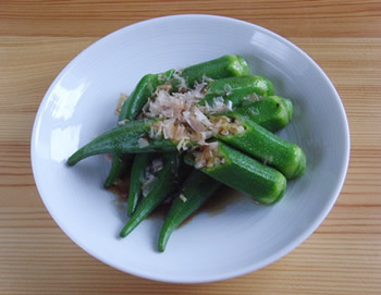 3.オクラを器に盛り、かつおぶしと、酢としょうゆをかけて食べる。(味加減は食べながらやってみて)