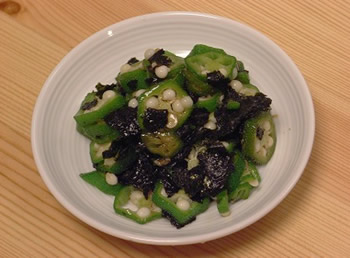 3.オクラを器に盛り、のりを細かくちぎって混ぜる。酢としょうゆをかけて食べる。(味加減は食べながらやってみて下さい。)