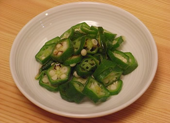 1.オクラは、塩少々を入れた熱湯でさっとゆでる。(この「さっと」の加減がいつも分かりづらいが、オクラを熱湯に入れて、おとなしくなったお湯が再び沸騰し始める頃が目安らしい)
