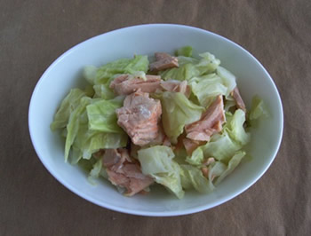 4.サケを取り出して、骨や皮を除いてから、キャベツと混ぜる。