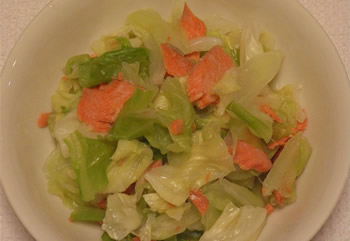 4.サケを取り出して、骨や皮を除いてから、キャベツと混ぜる。