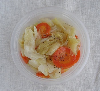 2.耐熱容器に、キャベツとニンジンを入れ、鶏がらスープの素と、サラダ油を上にかけ、ふたをしたら、電子レンジで、8分程加熱する。(キャベツの芯が柔らかくなるまで)