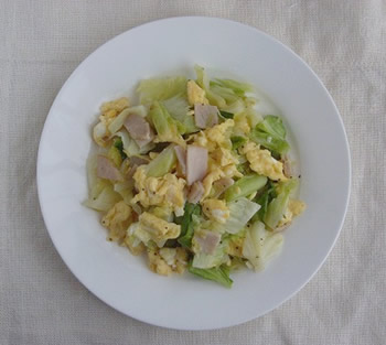 5.4のフライパンに、サラダ油を少し足し、ベーコンをいためたあと、1のキャベツをいため合わせ、キャベツが透き通ったら、4の卵を戻して、全体をいため合せ、塩・こしょうで味を調える。