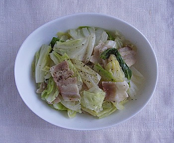 1.キャベツは、3~4cm角の大きさに切る。ベーコンは3cm幅に切る。