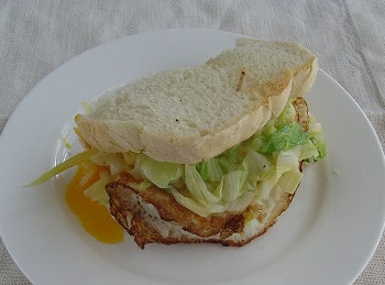 4.パンを焼いて、バターを塗り、キャベツと目玉焼きをはさむ。