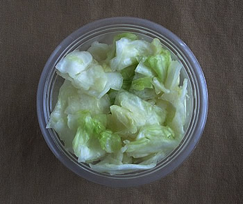 2.ポリ袋に、キャベツと浅漬けの素を入れ、口を縛って、全体に浅漬けの素が行き渡るようにもんだら、冷蔵庫で30分漬ける。