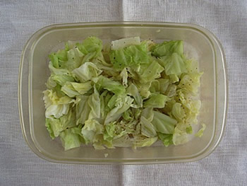 1.キャベツはざく切りにし、耐熱容器に入れる。(このとき、堅い部分は上になるようにする。)顆粒コンソメとこしょうをかけて、ふた(またはラップ)をしたら、電子レンジで5~6分加熱し、全体を混ぜる。