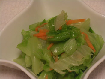 4.耐熱容器に、キャベツと、ニンジンと、昆布茶を入れ混ぜる。