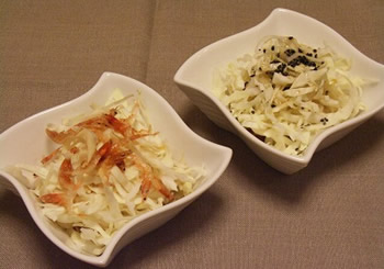2.酢としょうゆを混ぜ、キャベツと混ぜる。さくらえびを振る。