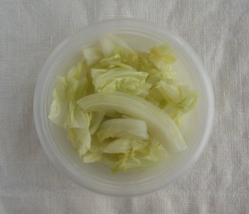 1.キャベツはざく切りにして、耐熱容器に入れ、鶏がらスープをふりかけたら、ふたをして電子レンジで7分程加熱する。