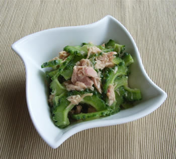 1.ゴーヤはわたを取って、薄切りにし、レモン汁につけて冷しておく。