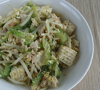 1.ゴーヤは縦半分に切ったあと、わたをくりぬいて、2mm幅に薄切り。豆腐と豚肉は食べやすく切る。