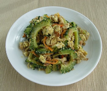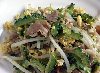 夏が終わる前に、是非食べておきたいゴーヤー。この苦味が体にいいようですな。まだこの苦味に十分に慣れていないので、塩もみを十分にしました。味付けは、ゴマ油と塩・こしょうだけですが、豚肉の旨みと、卵の甘みに、ゴーヤーの苦味が見事にマッチしていて、とっても美味しかったです。(もやしはなくてもいいです。木綿豆腐をいれてもいい。)