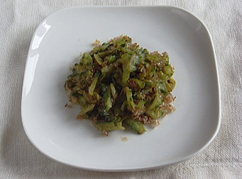 4.ゴーヤーの色が鮮やかになったら、しょうゆとかつお節を入れ混ぜて、火を止める。