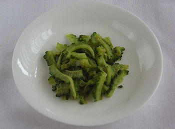 3.フライパンを熱して、油をいれ、ゴーヤーを投入し、強火でいためる。