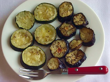 2.ズッキーニとなすを1cmの輪切りにして、1に並べる。