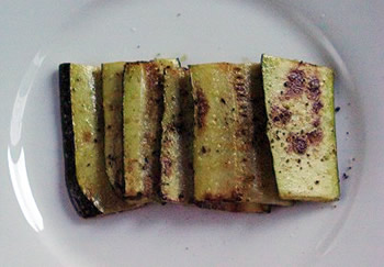2.フライパンにオリーブ油を熱し、ズッキーニを両面こんがり焼く。