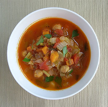 3.分量の湯を加え、もう一度沸騰させる。白ワインを入れてアルコールを飛ばし、トマト缶とひよこ豆を加えて、塩2/3で調味する。ふたをずらしてのせ、中火で30分煮る。仕上げに塩とこしょうで味を調え、彩りにイタリアンパセリを散らす。