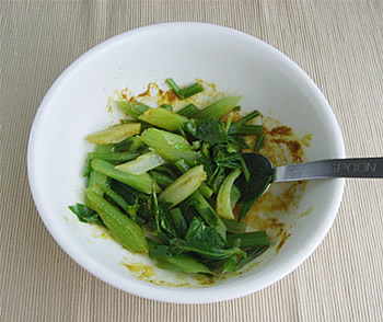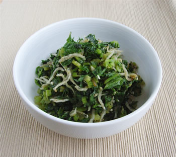 2.フライパンにごま油を熱して、セロリの茎から炒め始める。しんなりしたら、葉を入れて、さらにいため、葉もしんなりしてきたら、じゃこを加えて炒め合せる。