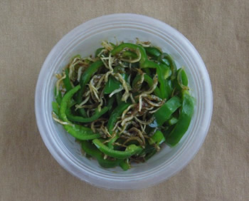 2.フライパンを熱してオリーブ油を入れ、ちりめんじゃこを炒め、続いてピーマンを入れ合わせ炒める。最後にしょうゆを加え混ぜる。