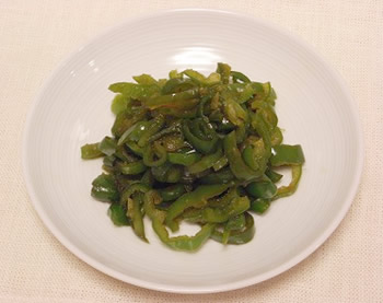 1.ピーマンは、縦半分に切って、へたと種を除き、横に5mm幅に切る。